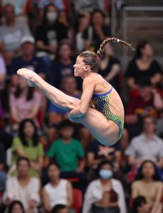 (250727) -- SINGAPUR, 27 julio, 2025 (Xinhua) -- Imagen del 26 de julio de 2025 de Luana Lira, de Brasil, compitiendo durante la final de 3m y 10m por equipos mixtos de clavados en el Campeonato Mundial de Deportes Acuáticos, en Singapur. (Xinhua/Luo Yuan) (rtg) (da)