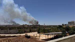 (250724) -- DAMASCO, 24 julio, 2025 (Xinhua) -- Humo se eleva desde el sitio de una explosión, en el norte de Idlib, Siria, el 24 de julio de 2025. Una potente explosión sacudió el jueves la provincia de Idlib, en el noroeste de Siria, causando víctimas e incendios cerca de la localidad de Maarrat Misrin, según la televisión estatal Ikhbariya TV. (Xinhua) (da) (ra) (ce)