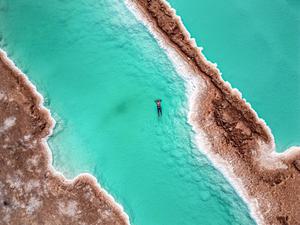 (250728) -- SIWA, 28 julio, 2025 (Xinhua) -- Vista aérea tomada con un dron el 28 de julio de 2025 de un turista flotando en un lago salado en el oasis de Siwa, en la Gobernación de Matrú, Egipto. El oasis de Siwa se encuentra en el desierto occidental de Egipto, a unos 800 kilómetros de El Cairo. Existen numerosos lagos salados naturales en los que se puede flotar sin esfuerzo gracias a la alta concentración de sal. (Xinhua/Ahmed Gomaa) (rtg) (ah) (vf)