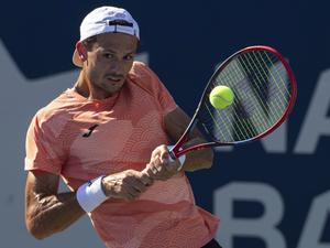 (250729) -- TORONTO, 29 julio, 2025 (Xinhua) -- Imagen del 27 de julio de 2025 de Juan Pablo Ficovich, de Argentina, devolviendo la pelota durante la primera ronda del partido de individuales masculinos entre Jacob Fearnley, de Reino Unido, y Juan Pablo Ficovich, de Argentina, en el torneo de tenis Abierto National Bank 2025, en Toronto, Canadá. (Xinhua/Zou Zheng) (oa) (ah)