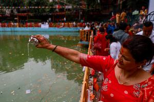 (250729) -- KATMANDU, 29 julio, 2025 (Xinhua) -- Una devota realiza un ritual para celebrar el Naga Panchami, un festival hindú dedicado a la adoración de las serpientes, en Katmandú, Nepal, el 29 de julio de 2025. (Xinhua/Sulav Shrestha) (oa) (ah) (ce)