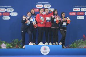 (250729) -- SINGAPUR, 29 julio, 2025 (Xinhua) -- Las medallistas de oro, Chen Jia (3-i)/Chen Yiwen (3-d), de China, las medallistas de plata, Yasmin Harper (i)/Scarlett Mew Jensen (2-i), de Reino Unido, y las medallistas de bronce, Lía Yatzil Cueva Lobato/Mía Zazil Cueva Lobato, de México, posan durante la ceremonia de premiación de la final de trampolín sincronizado femenino de 3m de clavados en el Campeonato Mundial de Deportes Acuáticos, en Singapur, el 29 de julio de 2025. (Xinhua/Then Chih Wey) (jg) (ra) (ce)