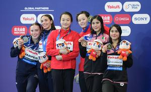 (250729) -- SINGAPUR, 29 julio, 2025 (Xinhua) -- Las medallistas de oro, Chen Jia (3-i)/Chen Yiwen (3-d), de China, las medallistas de plata, Yasmin Harper (i)/Scarlett Mew Jensen (2-i), de Reino Unido, y las medallistas de bronce, Lía Yatzil Cueva Lobato/Mía Zazil Cueva Lobato, de México, posan durante la ceremonia de premiación de la final de trampolín sincronizado femenino de 3m de clavados en el Campeonato Mundial de Deportes Acuáticos, en Singapur, el 29 de julio de 2025. (Xinhua/Wu Zhizun) (jg) (ra) (ce)