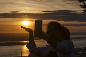 (250704) -- BEIJING, 4 julio, 2025 (Xinhua) -- Una turista toma fotografías del sol saliendo en el Pabellón Dongji, en...