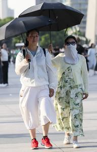 (250704) -- SHANGHAI, 4 julio, 2025 (Xinhua) -- Personas caminan con sombrillas durante el clima cálido, en Shanghai, en el...