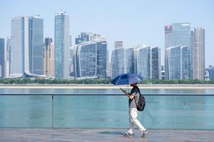 (250703) -- HANGZHOU, 3 julio, 2025 (Xinhua) -- Un hombre sostiene una sombrilla mientras camina a lo largo del río...