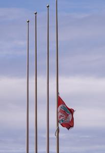 (250703) -- LIVERPOOL, 3 julio, 2025 (Xinhua) -- La bandera del Liverpool FC ondea a media asta afuera del estadio...