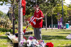 (250703) -- LIVERPOOL, 3 julio, 2025 (Xinhua) -- Una aficionada rinde tributo a Diogo Jota afuera del estadio Anfield, en...