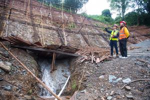 (250730) -- ZHOUSHAN, 30 julio, 2025 (Xinhua) -- Empleados patrullan un área con alto riesgo de desastres geológicos, en la...