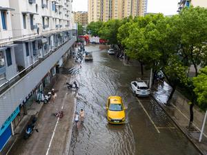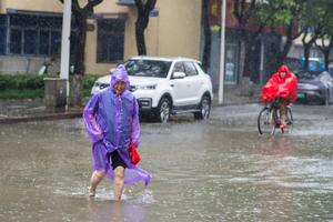 (250730) -- ZHOUSHAN, 30 julio, 2025 (Xinhua) -- Un residente vadea a través de un área anegada, en la ciudad...