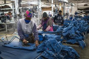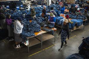 (250730) -- MASERU, 30 julio, 2025 (Xinhua) -- Imagen del 29 de julio de 2025 de trabajadoras acomodando pantalones vaqueros...
