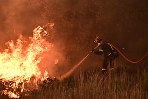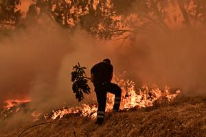 (250731) -- DROSOPIGI, 31 julio, 2025 (Xinhua) -- Imagen del 26 de julio de 2025 de un bombero combatiendo las...