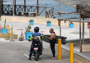 (250730) -- LIMA, 30 julio, 2025 (Xinhua) -- Un trabajador municipal (i) habla con un surfista en la playa San...
