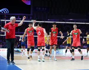 (250730) -- NINGBO, 30 julio, 2025 (Xinhua) -- El equipo de China festeja un punto durante el partido entre China...