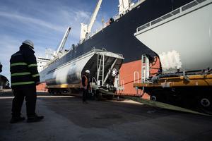 (250731) -- BUENOS AIRES, 31 julio, 2025 (Xinhua) -- Imagen del 30 de julio de 2025 de operarios portuarios acoplando...