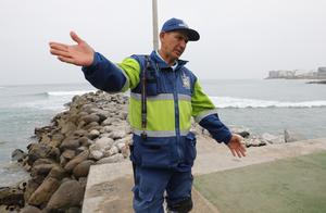 (250730) -- LIMA, 30 julio, 2025 (Xinhua) -- Un trabajador municipal reacciona en la playa San Bartolo, en el sur...