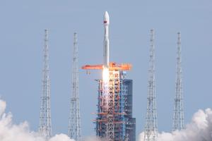 (250730) -- WENCHANG, 30 julio, 2025 (Xinhua) -- Un cohete portador Gran Marcha-8A transportando un grupo de satélites a la...