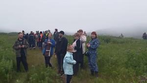 (250730) -- SEVERO-KURILSK, 30 julio, 2025 (Xinhua) -- Personas se refugian del tsunami en un terreno elevado, en Severo-Kurilsk de...