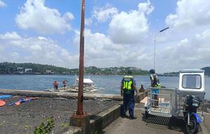 (250730) -- LEGAZPI, 30 julio, 2025 (Xinhua) -- Trabajadores con policías locales realizan una inspección de emergencia a lo largo...