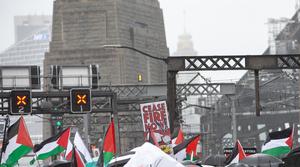 (250803) -- SIDNEY, 3 agosto, 2025 (Xinhua) -- Personas sostienen banderas y carteles mientras marchan a través del Puente del Puerto para protestar por la guerra y la hambruna en Gaza, en Sídney, Australia, el 3 de agosto de 2025. Decenas de miles de australianos marcharon el domingo a través del emblemático Puente del Puerto de Sídney para protestar por la guerra y la hambruna en Gaza. (Xinhua/Ma Ping) (oa) (ah)