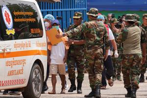 (250801) -- ODDAR MEANCHEY, 1 agosto, 2025 (Xinhua) -- Soldados camboyanos reciben un soldado camboyano devuelto en el puesto de control fronterizo de O'Smach, en la provincia de Oddar Meanchey, Camboya, el 1 de agosto de 2025. El Ejército tailandés liberó el viernes a dos de los 20 soldados camboyanos que capturó después de que entró en vigor un alto el fuego, dijo un portavoz del Ministerio de Defensa de Camboya. (Xinhua/Agence Kampuchea Press) (rtg) (ra) (ce)