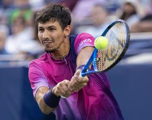 (250803) -- TORONTO, 3 agosto, 2025 (Xinhua) -- Imagen del 2 de agosto de 2025 de Alexei Popyrin, de Australia, devolviendo la pelota durante el partido de octavos de final de individuales masculinos entre Alexei Popyrin, de Australia, y Holger Rune, de Dinamarca, en el torneo de tenis Abierto National Bank 2025, en Toronto, Canadá. (Xinhua/Zou Zheng) (rtg) (da)