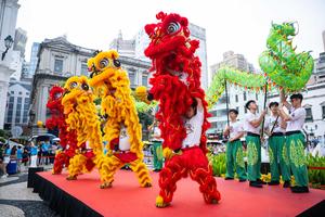 (250801) -- MACAO, 1 agosto, 2025 (Xinhua) -- Ciudadanos realizan la danza del león para celebrar la cuenta regresiva de 100 días para los XV Juegos Nacionales de China, en Macao, en el sur de China, el 1 de agosto de 2025. Los XV Juegos Nacionales de China serán organizados en conjunto por Guangdong, Hong Kong y Macao en noviembre de 2025. (Xinhua/Cheong Kam Ka) (jg) (da) (ce)