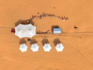 (250802) -- ERDOS, 2 agosto, 2025 (Xinhua) -- Vista aérea tomada con un dron el 1 de agosto de 2025 de personas haciendo fila para experimentar el todoterreno en el desierto, en la bandera de Dalad de la ciudad de Erdos, en la región autónoma de Mongolia Interior, en el norte de China. El desierto de Kubuqi, en la ciudad de Erdos, ha entrado en su temporada alta de turismo en pleno verano, atrayendo a numerosos turistas de todo el país para visitar. (Xinhua/Lian Zhen) (oa) (da)