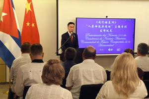 (250802) -- LA HABANA, 2 agosto, 2025 (Xinhua) -- Imagen del 1 de agosto de 2025 de embajador de China en Cuba, Hua Xin (atrás), pronunciando un discurso en la presentación de la revista cubana Cuadernos de Nuestra América, en La Habana, capital de Cuba. El concepto de comunidad de futuro compartido propuesto por China es analizado por distintos especialistas en un nuevo número de la revista cubana Cuadernos de Nuestra América, presentado el viernes en La Habana por el Centro de Investigaciones de Política Internacional. (Xinhua/Joaquín Hernández) (jh) (da)