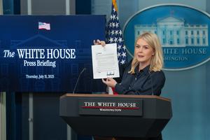 (250801) -- WANSHINGTON, 1 agosto, 2025 (Xinhua) -- Imagen del 31 de julio de 2025 de la secretaria de Prensa de la Casa Blanca, Karoline Leavitt, mostrando una carta del presidente de Estados Unidos, Donald Trump, durante una conferencia de prensa en la Casa Blanca, en Washington, D.C., Estados Unidos. Trump envió cartas el jueves a los directores generales de 17 compañías farmacéuticas en un intento por presionarlos para que reduzcan el precio de los medicamentos en un lapso de 60 días, y amenazó con tomar medidas si se niegan a cumplir. (Xinhua/Hu Yousong) (jg) (da) (ce)