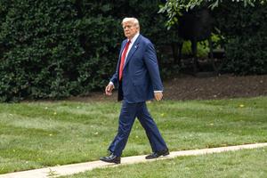 250801) -- WASHINGTON, 1 agosto, 2025 (Xinhua) -- El presidente estadounidense, Donald Trump, camina hacia el Jardín Sur de la Casa Blanca, en Washington D.C., Estados Unidos, el 1 de agosto de 2025. El presidente de Estados Unidos, Donald Trump, anunció el viernes que ordenó el despido de Erika McEntarfer, comisionada de la Oficina de Estadísticas Laborales (BLS, por sus siglas en inglés), a quien acusó de manipular la información con fines políticos. (Xinhua/Hu Yousong) (vf)