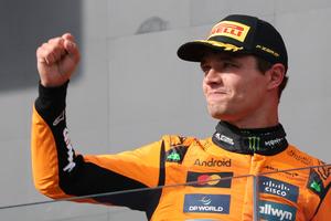 (250804) -- MOGYOROD, 4 agosto, 2025 (Xinhua) -- Imagen del 3 de agosto de 2025 del piloto británico de la escudería McLaren, Lando Norris, reaccionando durante la ceremonia de premiación después de la carrera del Gran Premio de Hungría de Fórmula Uno, en el Hungaroring, en Mogyorod, cerca de Budapest, Hungría. (Xinhua/Attila Volgyi) (rtg) (ah) (ce)
