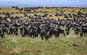 (250804) -- NAIROBI, 4 agosto, 2025 (Xinhua) -- Imagen del 31 de julio de 2025 de ñus pastando en la pradera de la Reserva Nacional Masai Mara, en Kenia. (Xinhua/Han Xu) (oa) (ah) (vf)