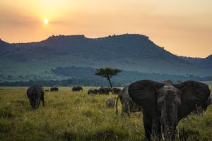 (250804) -- NAIROBI, 4 agosto, 2025 (Xinhua) -- Imagen del 29 de julio de 2025 de elefantes deambulando al atardecer en la Reserva Nacional Masai Mara, en Kenia. (Xinhua/Han Xu) (oa) (ah) (vf)