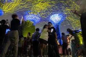 (250801) -- SINGAPUR, 1 agosto, 2025 (Xinhua) -- Turistas visitan la instalación de luces SPARK, con forma de luciérnagas, como parte de las actividades de celebración por el 60 aniversario de la Independencia de Singapur, llevada a cabo en los Jardines de la Bahía de Singapur, el 1 de agosto de 2025. (Xinhua/Then Chih Wey) (jg) (da) (ce)