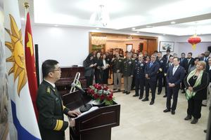(250802) -- MONTEVIDEO, 2 agosto, 2025 (Xinhua) -- Imagen del 1 de agosto de 2025 del agregado de defensa de la Embajada china en Uruguay, Coronel Superior Wang Shuai (i), pronunciando un discurso durante la celebración del 98° aniversario del Ejército Popular de Liberación (EPL) de China, en Montevideo, capital de Uruguay. Autoridades de China y Uruguay expresaron el viernes su compromiso con la paz y la cooperación bilateral en materia de defensa en el marco de la celebración en Montevideo del 98° aniversario del EPL de China. (Xinhua/Nicolás Celaya) (nc) (jg) (da)