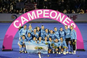 (250804) -- MONTEVIDEO, 4 agosto, 2025 (Xinhua) -- Imagen del 3 de agosto de 2025 de jugadoras de Argentina festejando tras obtener el trofeo al término de la final femenina de la Copa Panamericana de Hockey sobre Césped, ante Estados Unidos, en Carrasco, en Montevideo, capital de Uruguay. (Xinhua/Nicolás Celaya) (nc) (rtg) (ah) (vf)