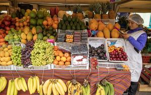 (250805) -- LIMA, 5 agosto, 2025 (Xinhua) -- Una vendedora de fruta espera por clientes en un puesto de un...
