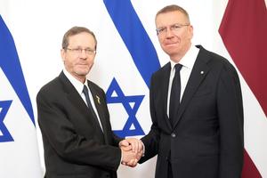 (250805) -- RIGA, 5 agosto, 2025 (Xinhua) -- El presidente letón, Edgars Rinkevics (d), estrecha la mano del visitante presidente...
