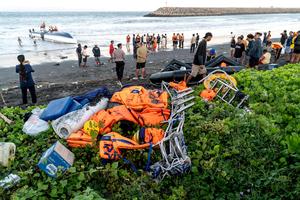 (250805) -- YAKARTA, 5 agosto, 2025 (Xinhua) -- Personas permanecen cerca de una lancha rápida tras su volcadura en la...