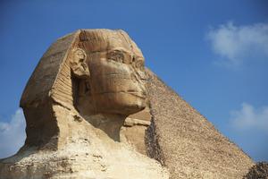 (250806) -- GIZA, 6 agosto, 2025 (Xinhua) -- Imagen del 5 de agosto de 2025 de la Esfinge en el punto escénico de las Pirámides de Giza, en Giza, Egipto. (Xinhua/Shadati) (jg) (da) (vf)