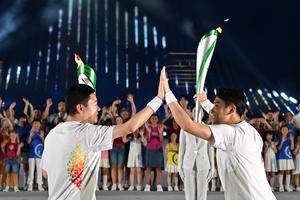 (250807) -- CHENGDU, 7 agosto, 2025 (Xinhua) -- Los portadores de la antorcha Ding Junhui (i) y Dong Dong chocan...
