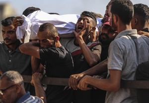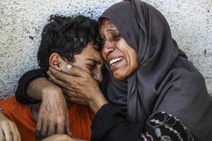 (250807) -- GAZA, 7 agosto, 2025 (Xinhua) -- Imagen del 6 de agosto de 2025 de palestinos lamentándose por una...