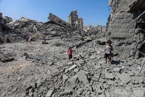 (250807) -- GAZA, 7 agosto, 2025 (Xinhua) -- Imagen del 6 de agosto de 2025 de palestinos vistos entre los...