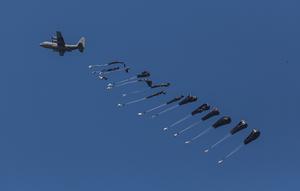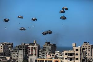 (250807) -- GAZA, 7 agosto, 2025 (Xinhua) -- Imagen del 6 de agosto de 2025 de ayuda humanitaria lanzada desde...