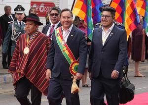 (250806) -- SUCRE, 6 agosto, 2025 (Xinhua) -- El presidente de Bolivia, Luis Arce (c), camina acompañado por el vicepresidente...
