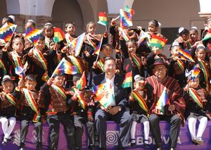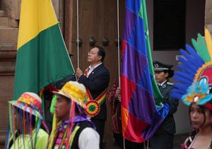 (250806) -- SUCRE, 6 agosto, 2025 (Xinhua) -- El presidente de Bolivia, Luis Arce (i-atrás), iza la bandera nacional boliviana...