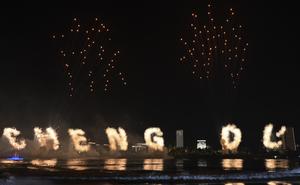 (250807) -- CHENGDU, 7 agosto, 2025 (Xinhua) -- Fuegos artificiales son vistos durante la ceremonia de inauguración de los Juegos...
