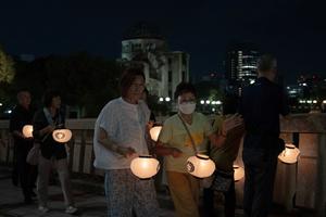 (250806) -- HIROSHIMA, 6 agosto, 2025 (Xinhua) -- Imagen del 5 de agosto de 2025 de manifestantes congregándose en el...