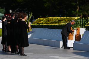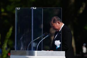(250806) -- HIROSHIMA, 6 agosto, 2025 (Xinhua) -- Invitados participan en una ceremonia memorial para conmemorar el 80 aniversario del...